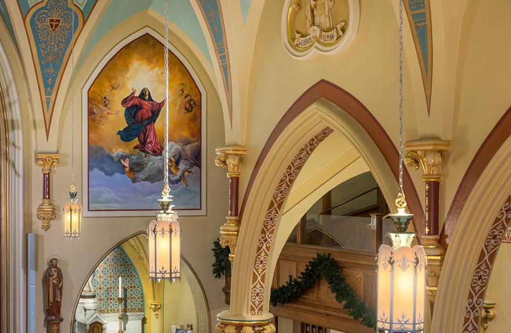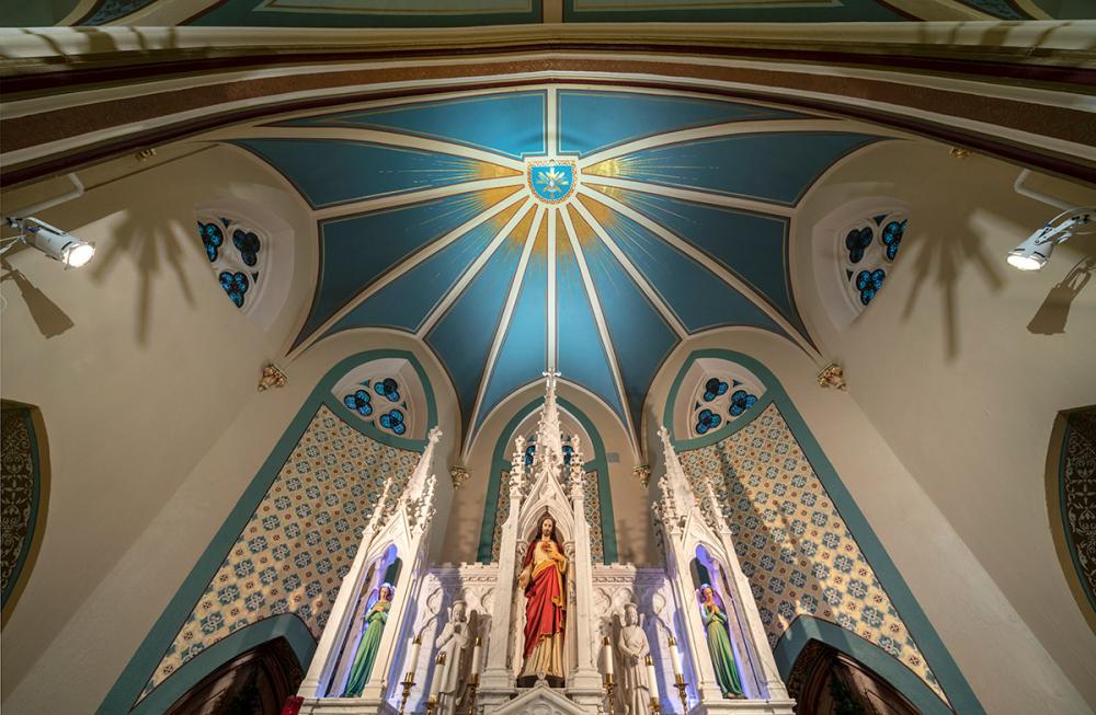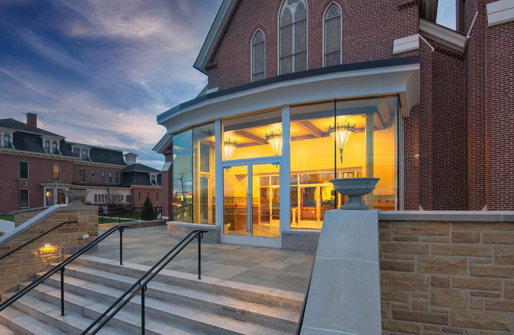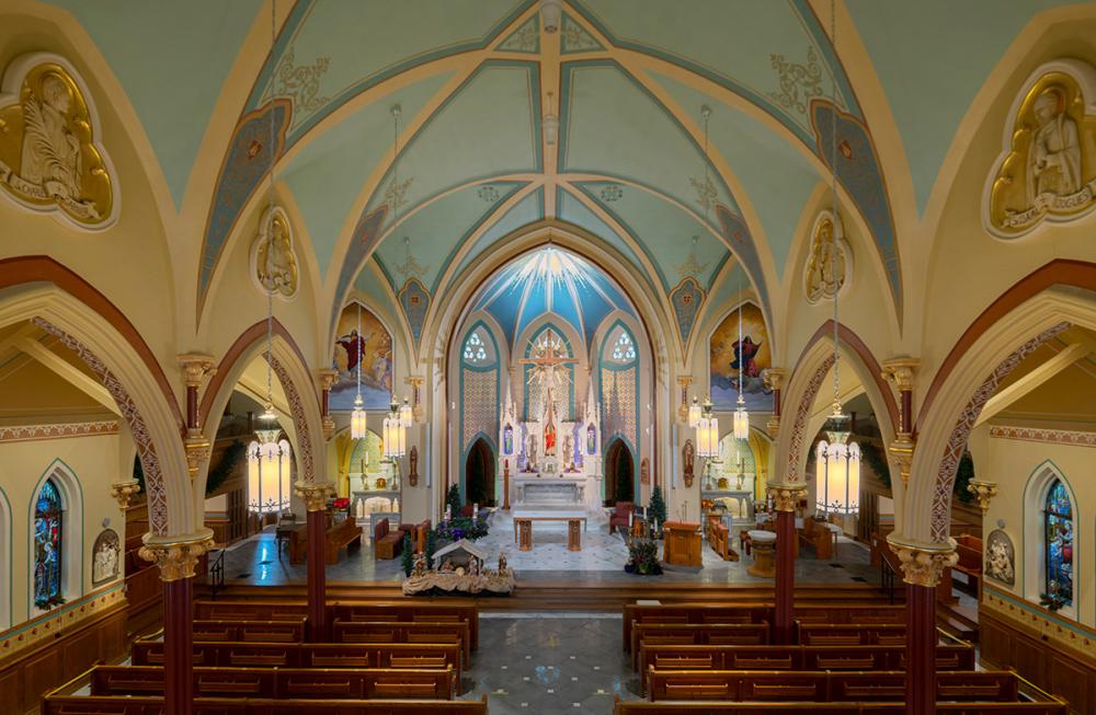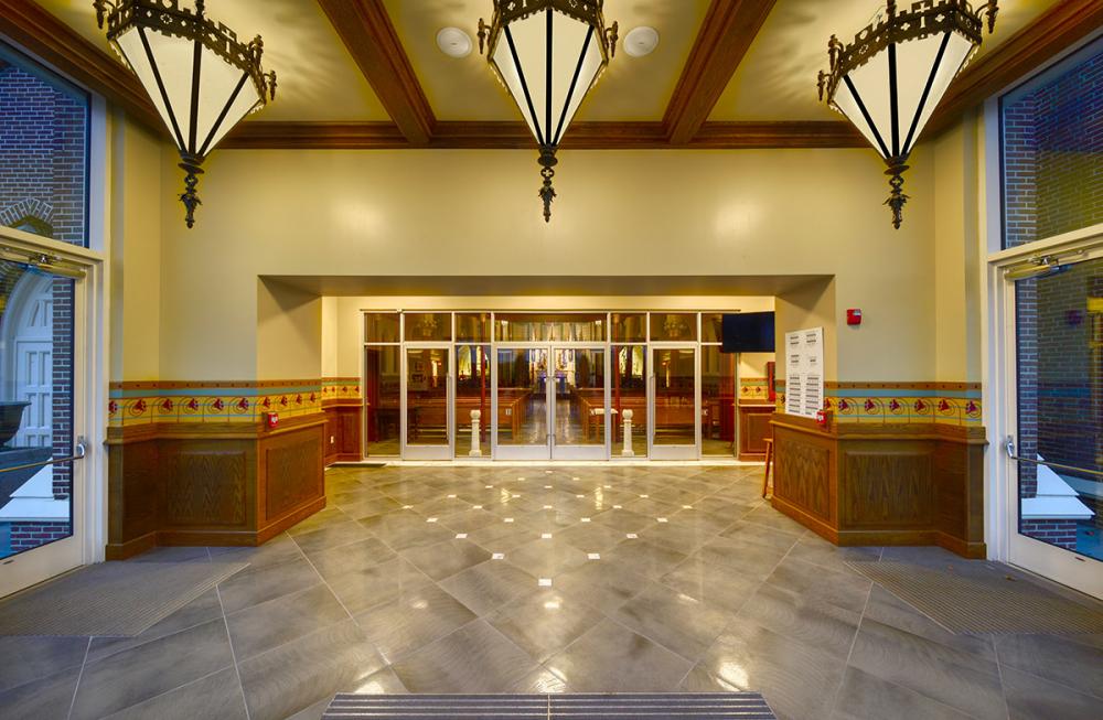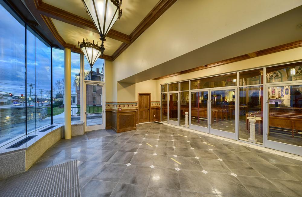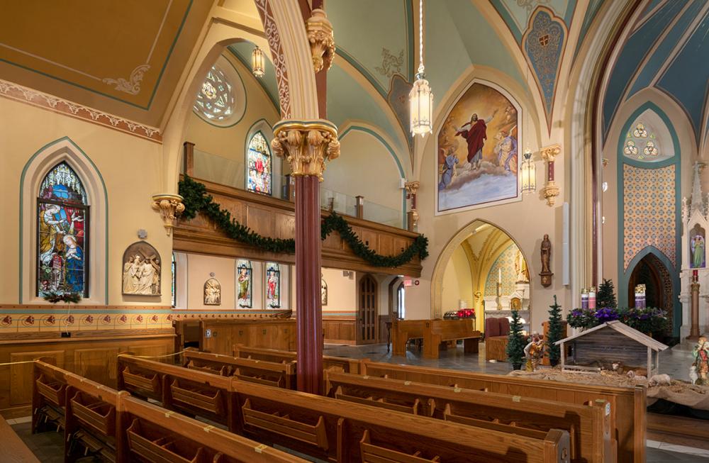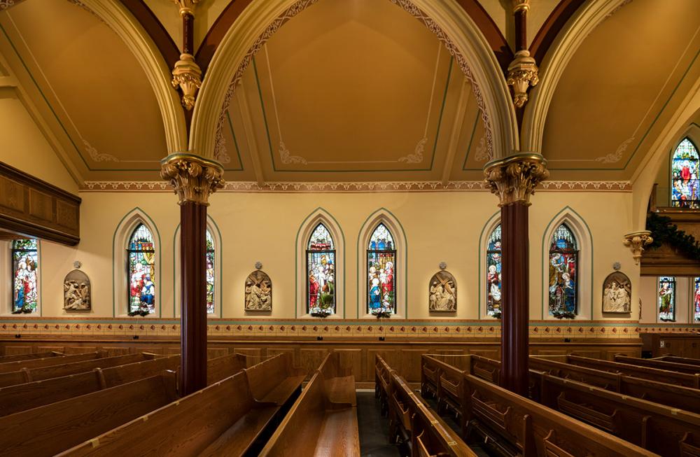 Together we replicated original paint details, stencils, carvings, and artwork. Advantage Signs replicated the 8 medallions, originally installed at Sacred Heart Church, using CNC machining, and hand-carving the finer features. The medallions were then finished by Swiatek Studios. Granite State Glass completed the glass narthex and tempered glass protective units for all of the stained-glass windows.