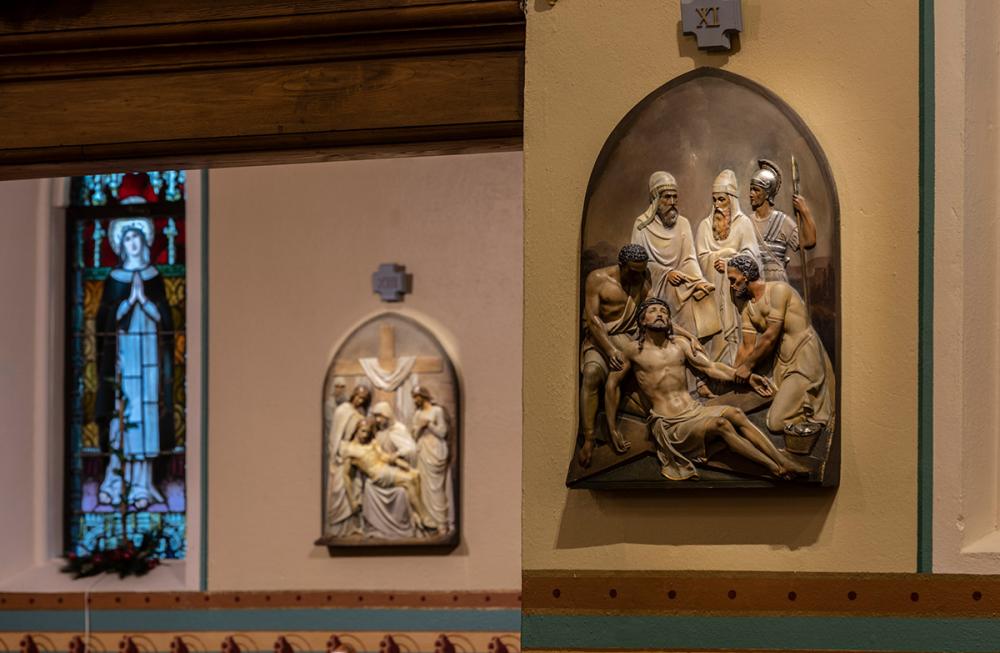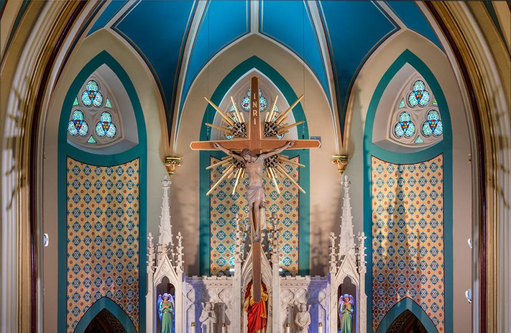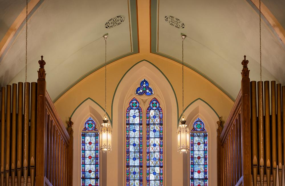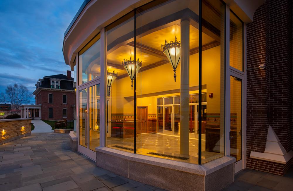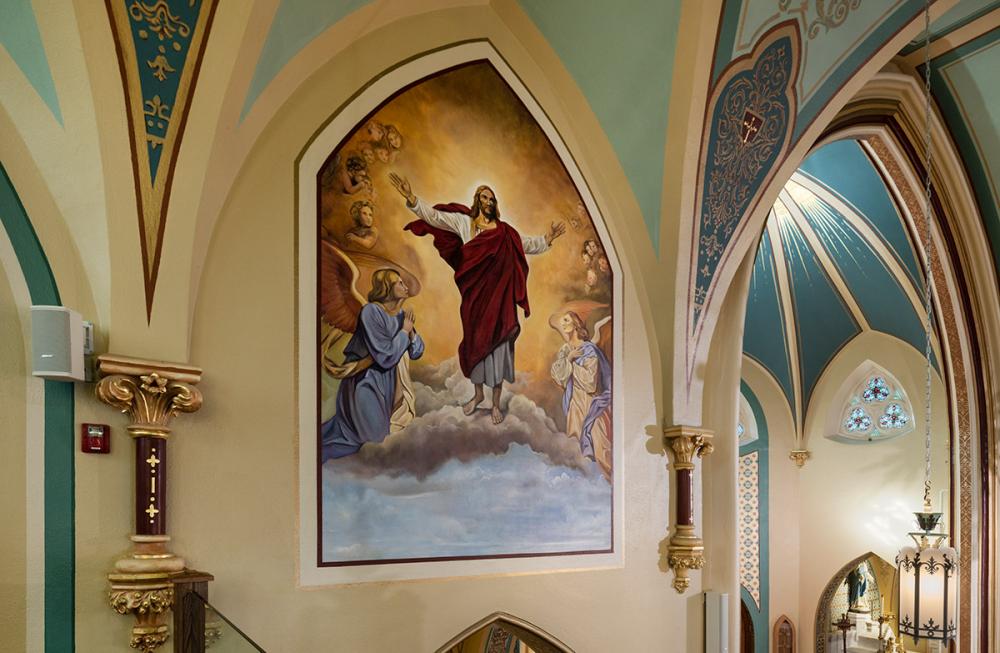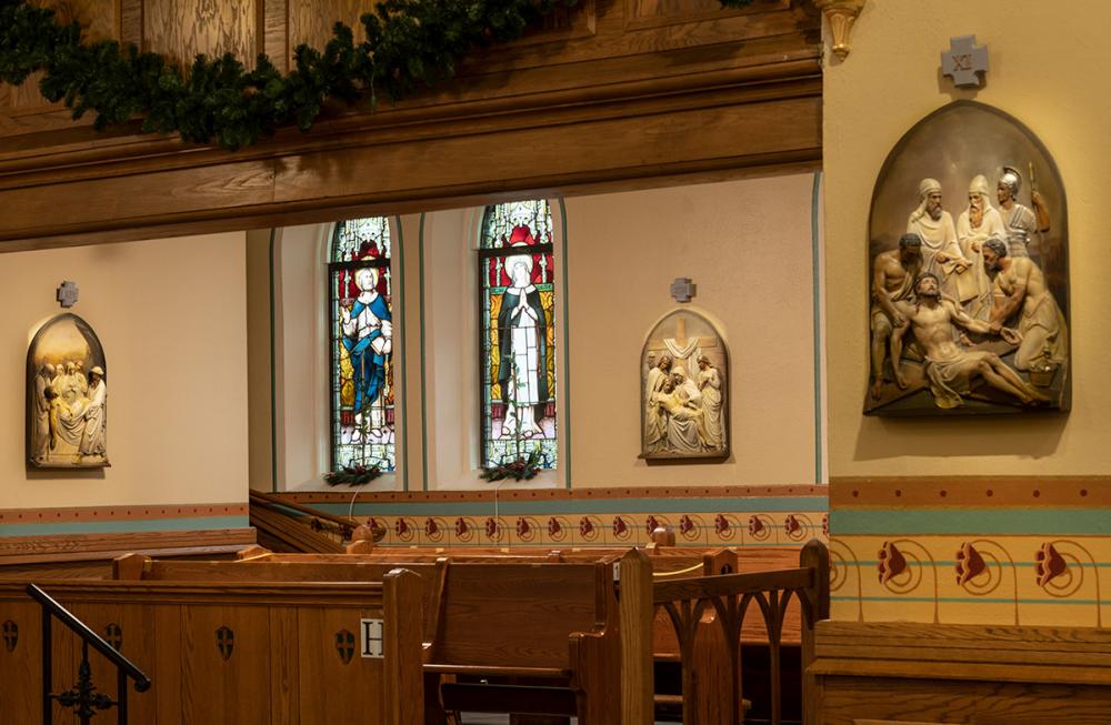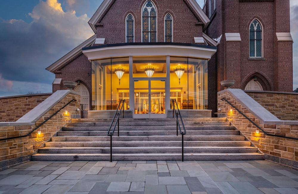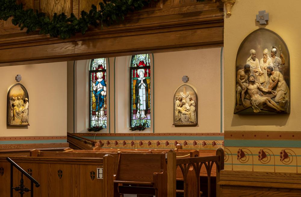 Together we replicated original paint details, stencils, carvings, and artwork. Advantage Signs replicated the 8 medallions, originally installed at Sacred Heart Church, using CNC machining, and hand-carving the finer features. The medallions were then finished by Swiatek Studios. Granite State Glass completed the glass narthex and tempered glass protective units for all of the stained-glass windows.