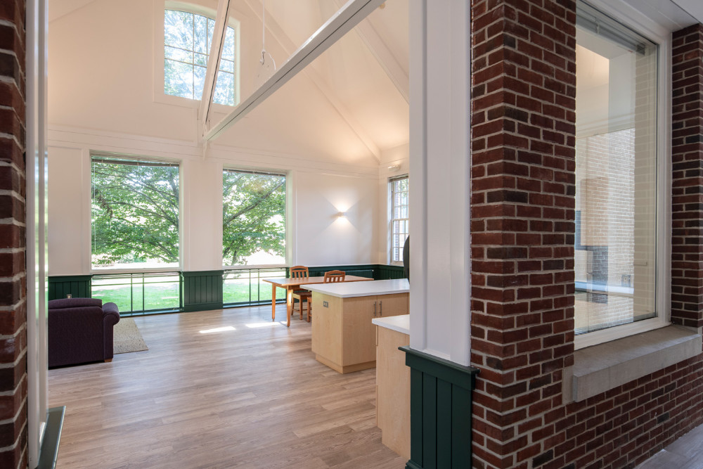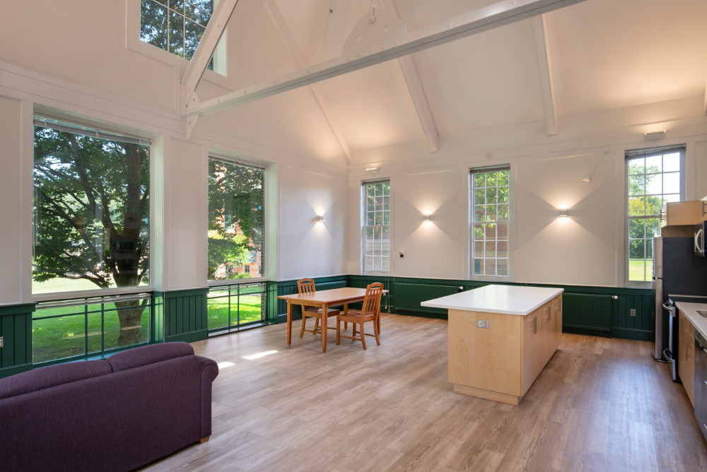 For the Bookstore, the old gas holder was renovated with built-in curved walls and octagonal finishes to provide a custom back drop for displaying products. A lift was installed to enable the use of the lower level for storage. Additional projects include a 4-unit faculty townhouse with garage bays and the Arts Walk with reformatted grades to make an ADA compliant walkway in the center of the campus.