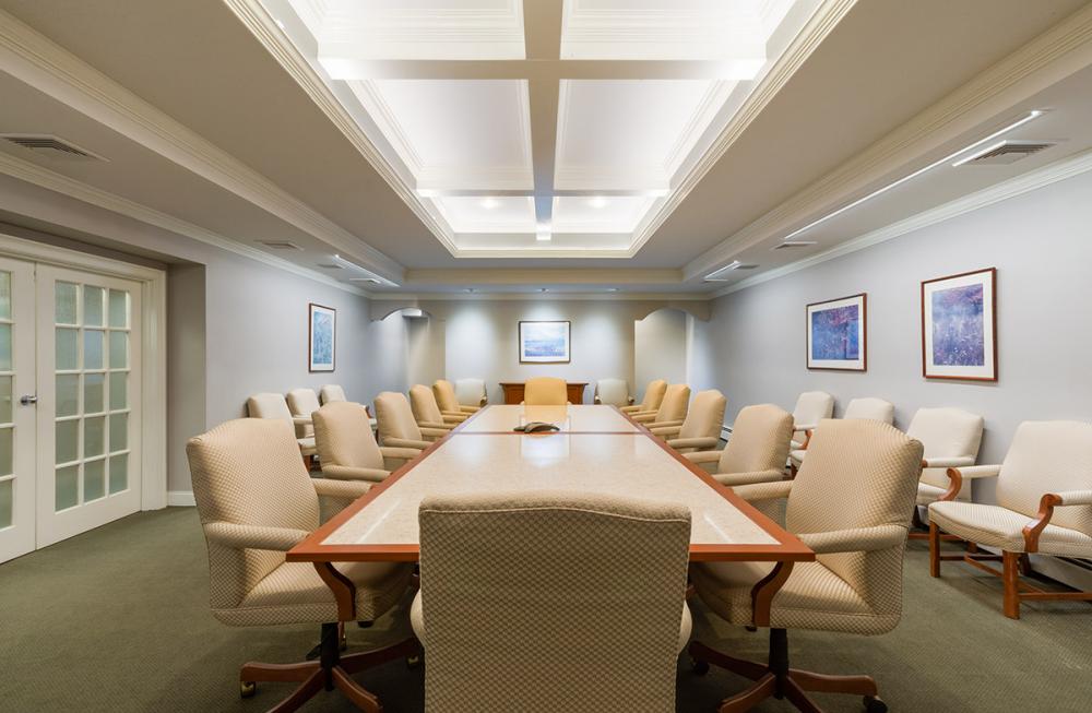 The job required meticulous care in working around the daily activities of a busy law office while completely gutting and renovating both an internal-use and a formal client conference room. The newly renovated rooms’ features include built-in audio-visual conferencing systems, new lighting, soundproofing, ventilation and spectacular finish carpentry of the ceiling ornamentation and lighting recesses in the formal conference room.